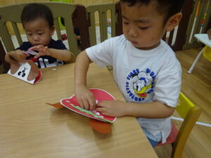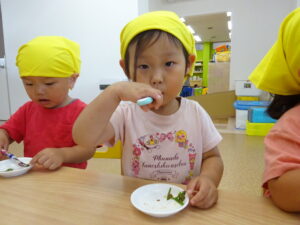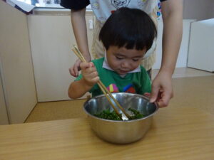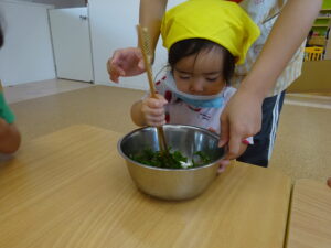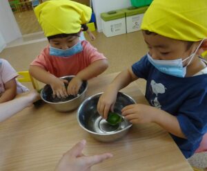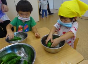 お庭で育てたピーマンが大きくなってきたのでぱんだ組さんでクッキング🥄🥢