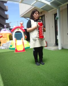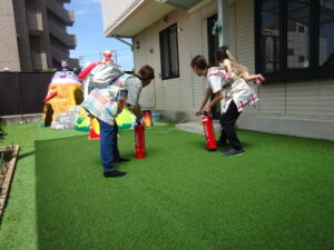 火事を想定した避難訓練をしました。消火器を使って消火もしました。