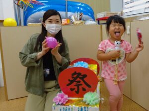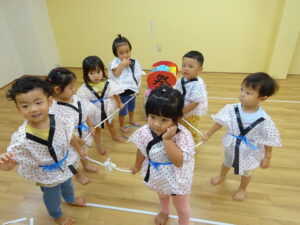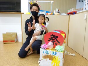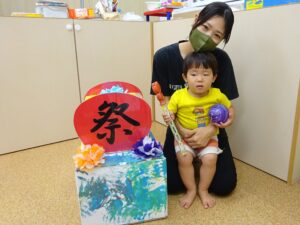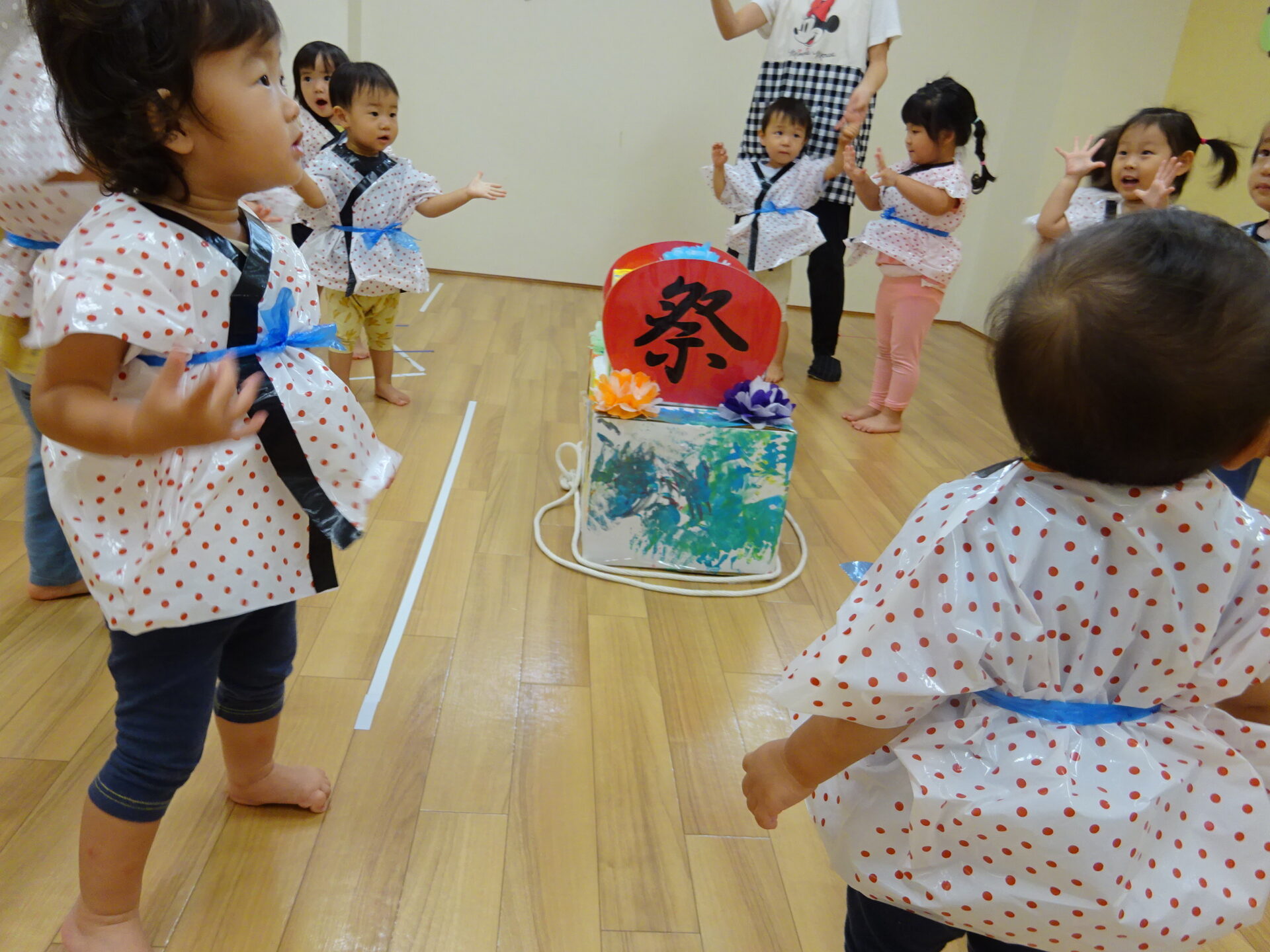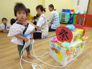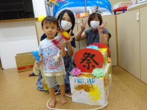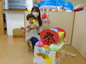 午前中は、手作りの法被を着て盆踊りとお神輿の練り歩き!