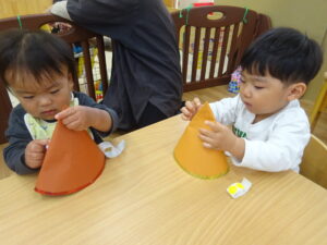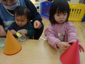 次は星やクリスマスのシールを貼って可愛くした三角帽子です。