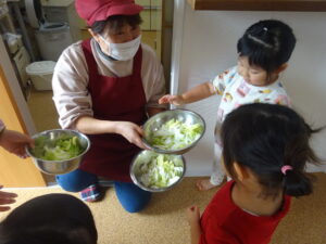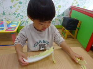 食育では、みんなで白菜をちぎりました。