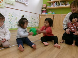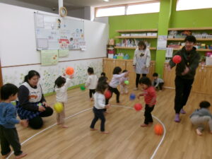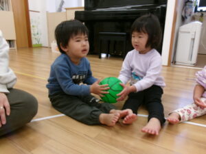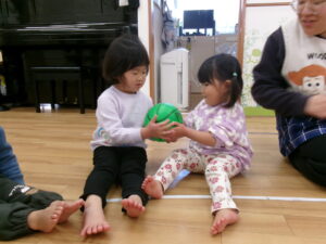 友だちにボールを渡していくゲームをしたりして遊びました!