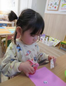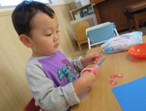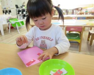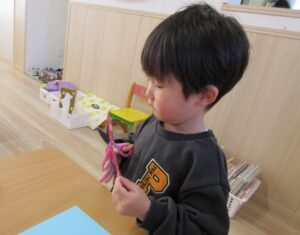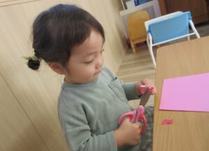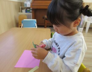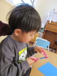 12月の製作しました。折り紙をチョキチョキ、のりでペタペタ。