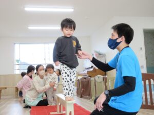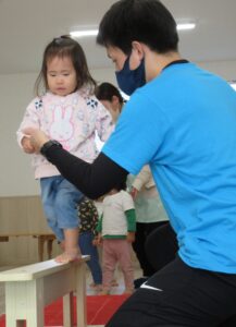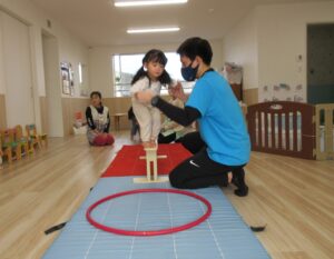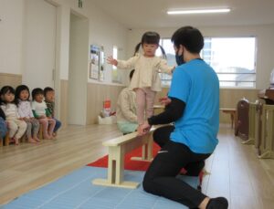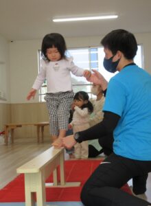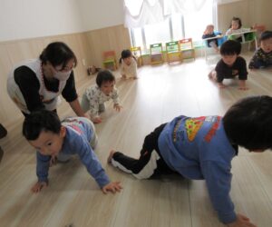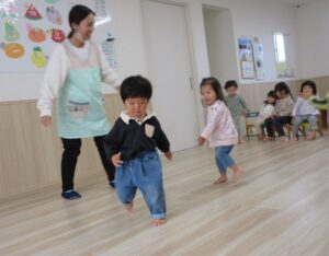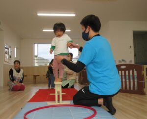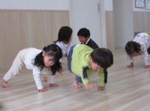 雨の日は、室内で体を動かします。音楽にのせて!馬になりきります。