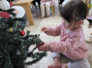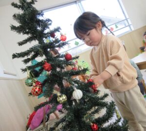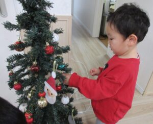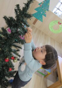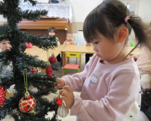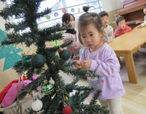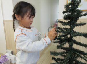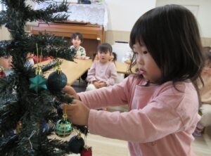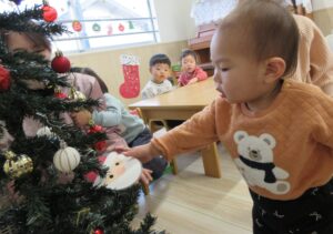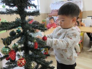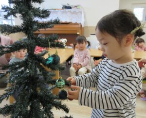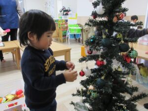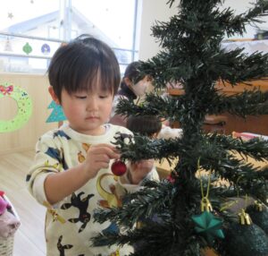 クリスマスのツリーの飾りつけをみんなで行いました。サンタさんほのす保育園にきてねーの願いを込めて!