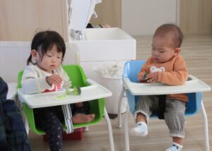 この赤い人はだれ―?と、固まっている様子の0,1歳児さんでした。