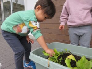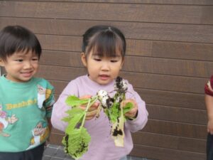ぱんださんが園庭のプランターで育てていたかぶを収穫しました。