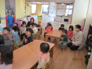 最初は職員の節分についてのお話。真剣に話を聞いています。