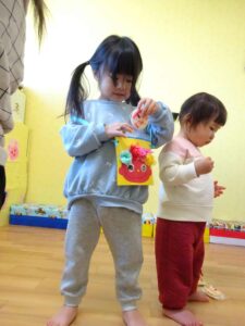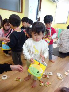 皆で鬼のパンツを踊ったり、豆(ボール)を投げる練習も