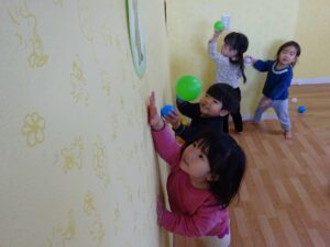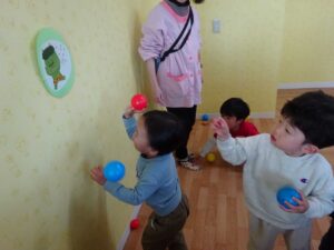 みんなでボールを投げ、壁に貼ってある鬼を退治しました。