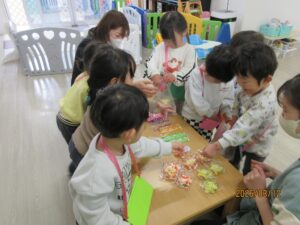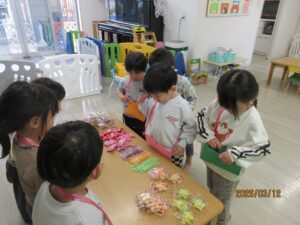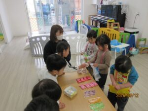 ぱんだ組のお友達が、お店屋さんごっこをしました。大好きなお菓子を買えることに大喜び!お店屋さんも、お客さんも張り切ってできました。