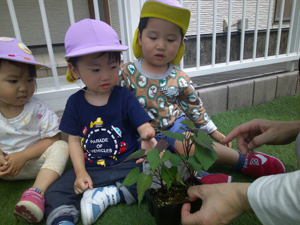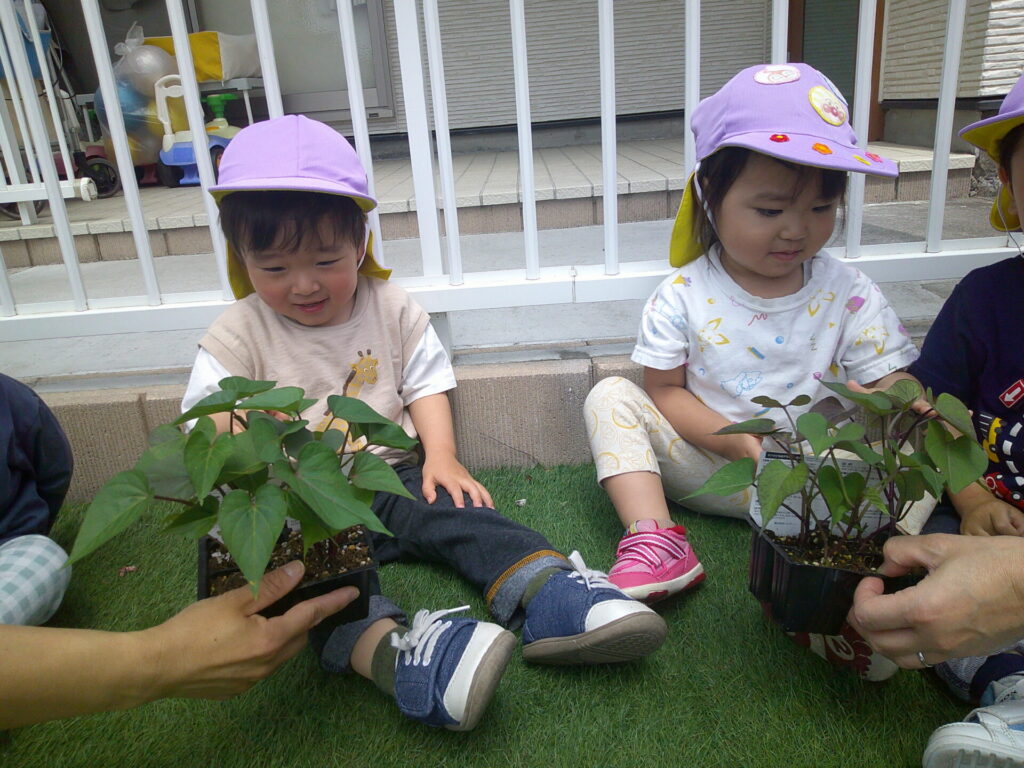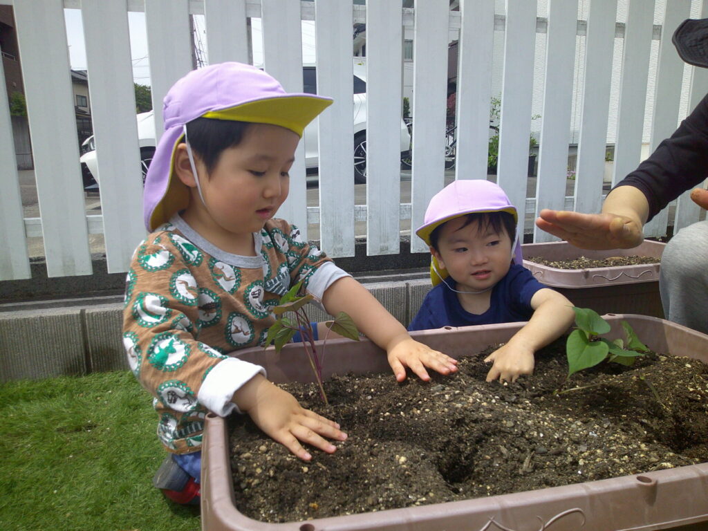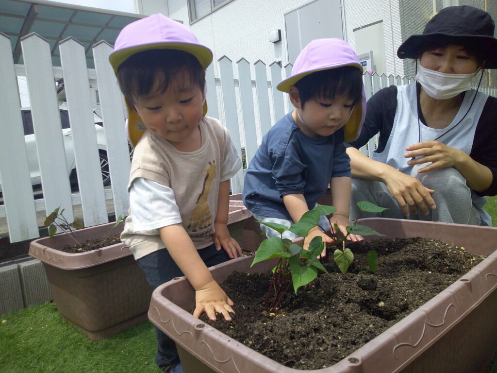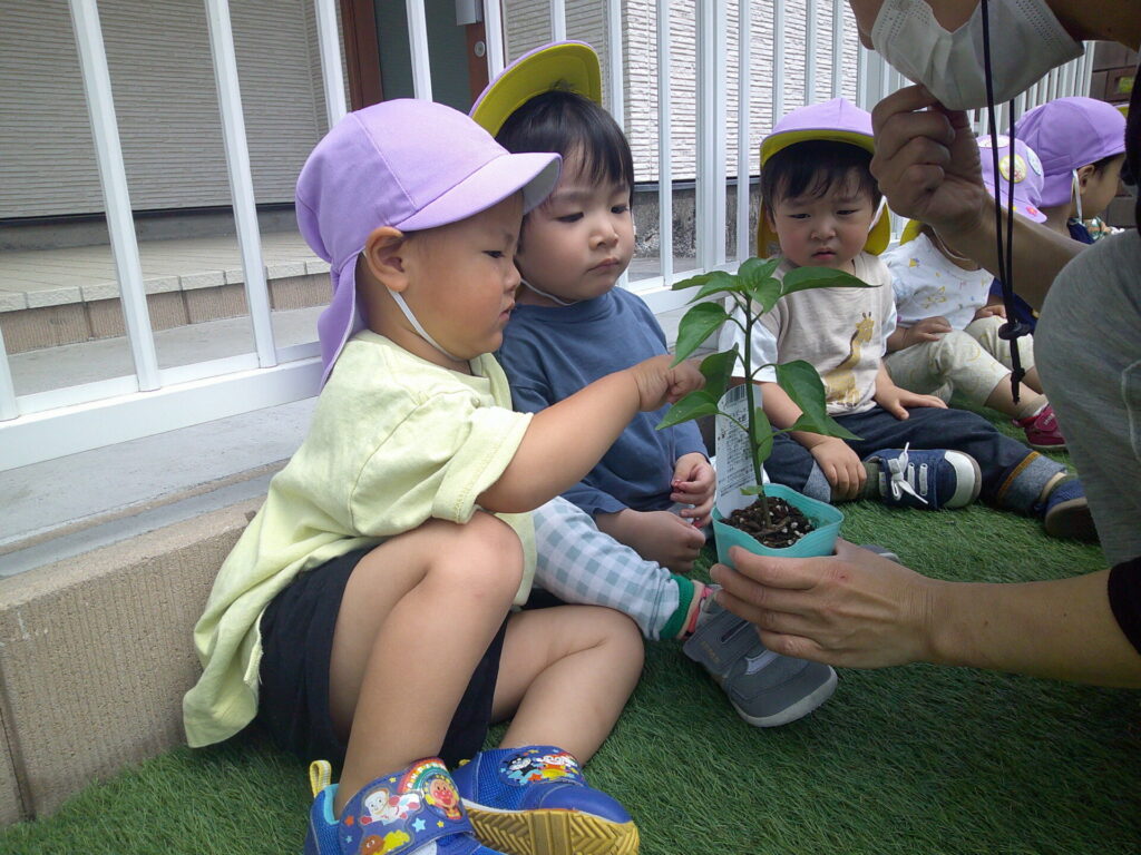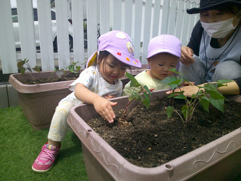 まずは、オクラとピーマンとさつまいもの苗植え!初めての苗を観察したり、優しく触ってみたりしました!
