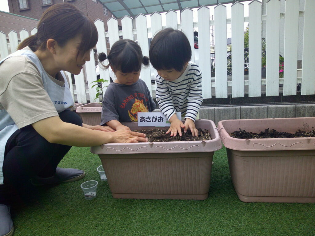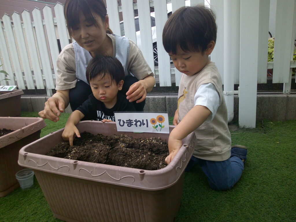 次は、ひまわりとあさがおと赤しその種を植えました!