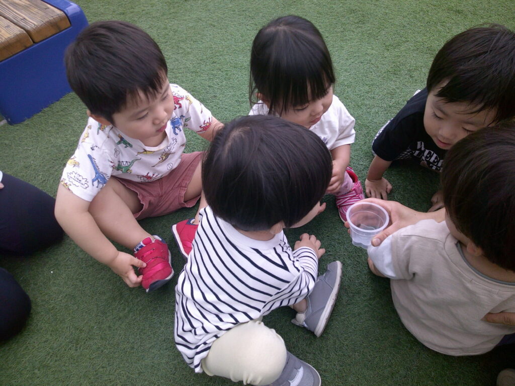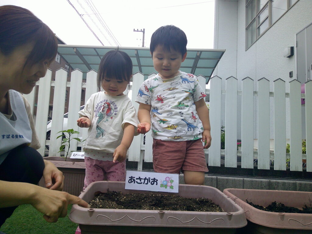 ある日、おおきくなったかな?と観察しながら水を掛けに行くと、早速ひまわりとあさがおの芽が出ました!!目に見える変化で子どもたちは、大喜びでした😊