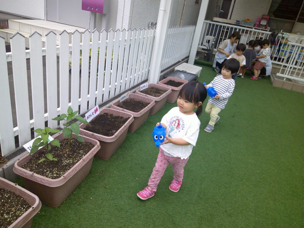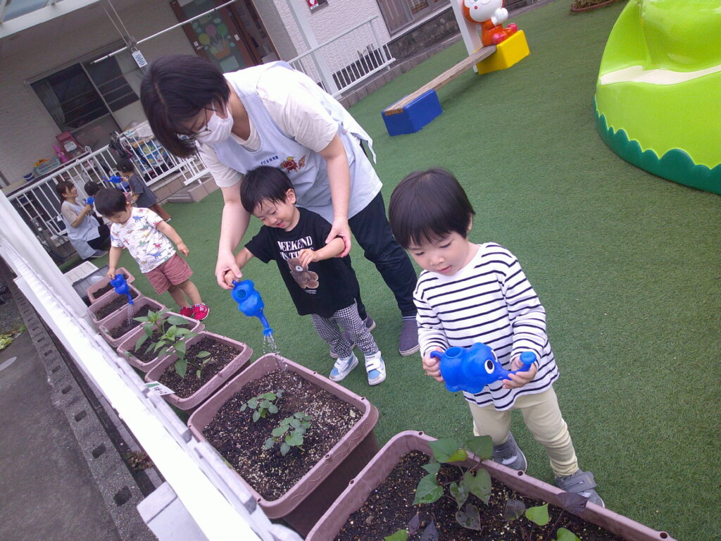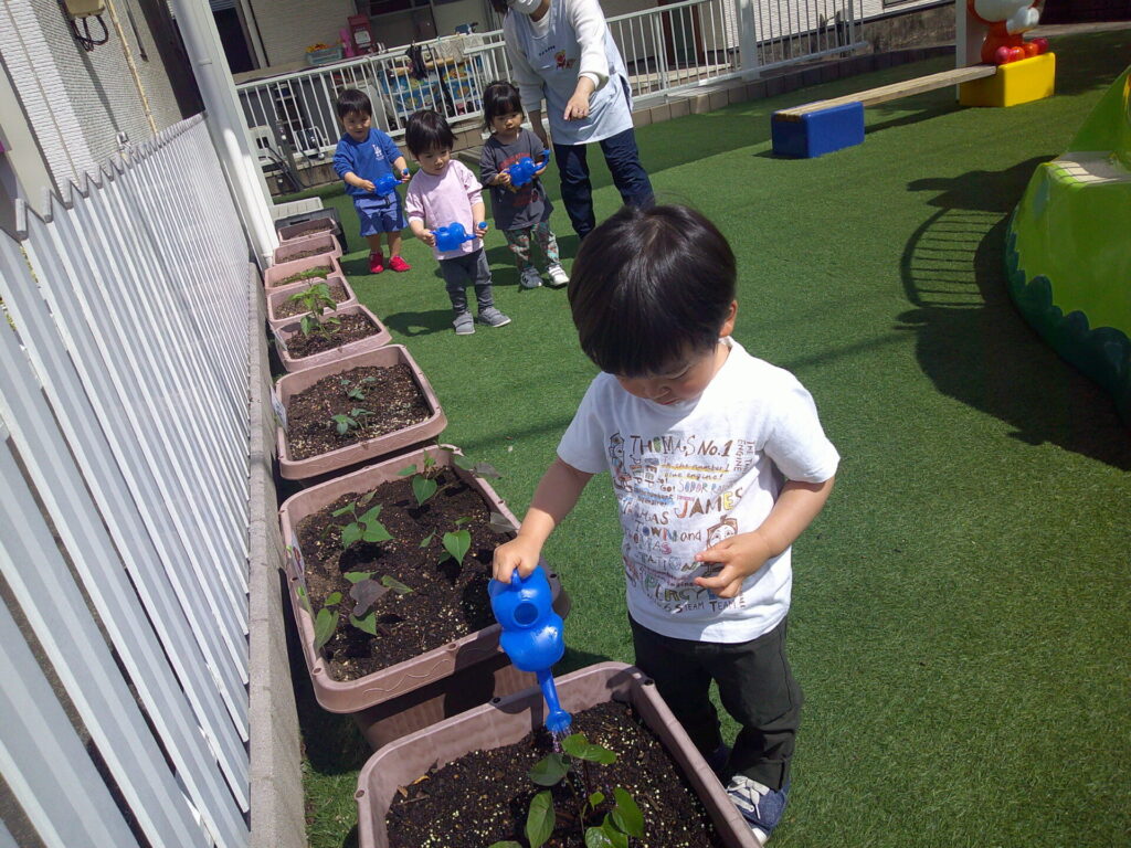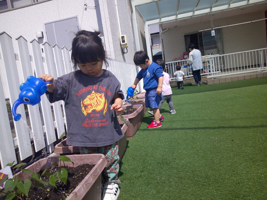 お水かけは、ぱんだ組さんの毎朝の日課!!こぼさないように、両手で慎重にぞうさんじょうろを持ってお水をかけてくれています。