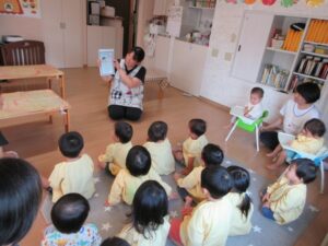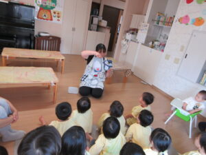 かき氷の絵本を読んでもらうと、絵本からぺんちゃんが飛び出してきて、すばる保育園のお友達にかき氷のプレゼントを持って来てくれました!