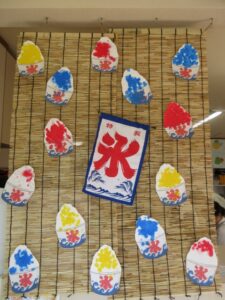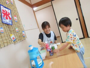 かき氷が完成したら、一人一人かき氷やさんに買いに行き、好きな味のシロップを選びました!