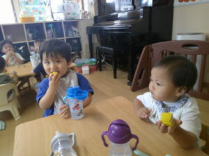 とうもろこしの皮を、みんなで力を合わせて剥きました!少しずつ、黄色の粒が見えると、「みえてきたー!」と張り切っていた子どもたち!!ひげにも気づき、丁寧に取ることが出来ました✨