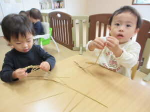 田んぼの稲から、お米が出来る事を教えてもらい、稲穂を触ったり、匂いを嗅いだり、観察をして、籾を取ってみました