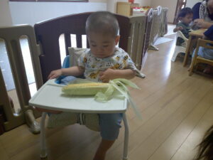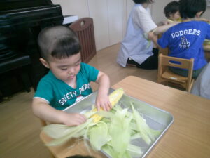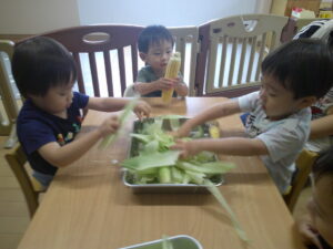 とうもろこしの皮を、みんなで力を合わせて剥きました!少しずつ、黄色の粒が見えると、「みえてきたー!」と張り切っていた子どもたち!!ひげにも気づき、丁寧に取ることが出来ました✨