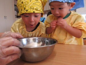 今回は、とうもろこしの皮剥き、煮干しの観察、フルーチェクッキング、稲穂の観察の4つの食育の様子を紹介します