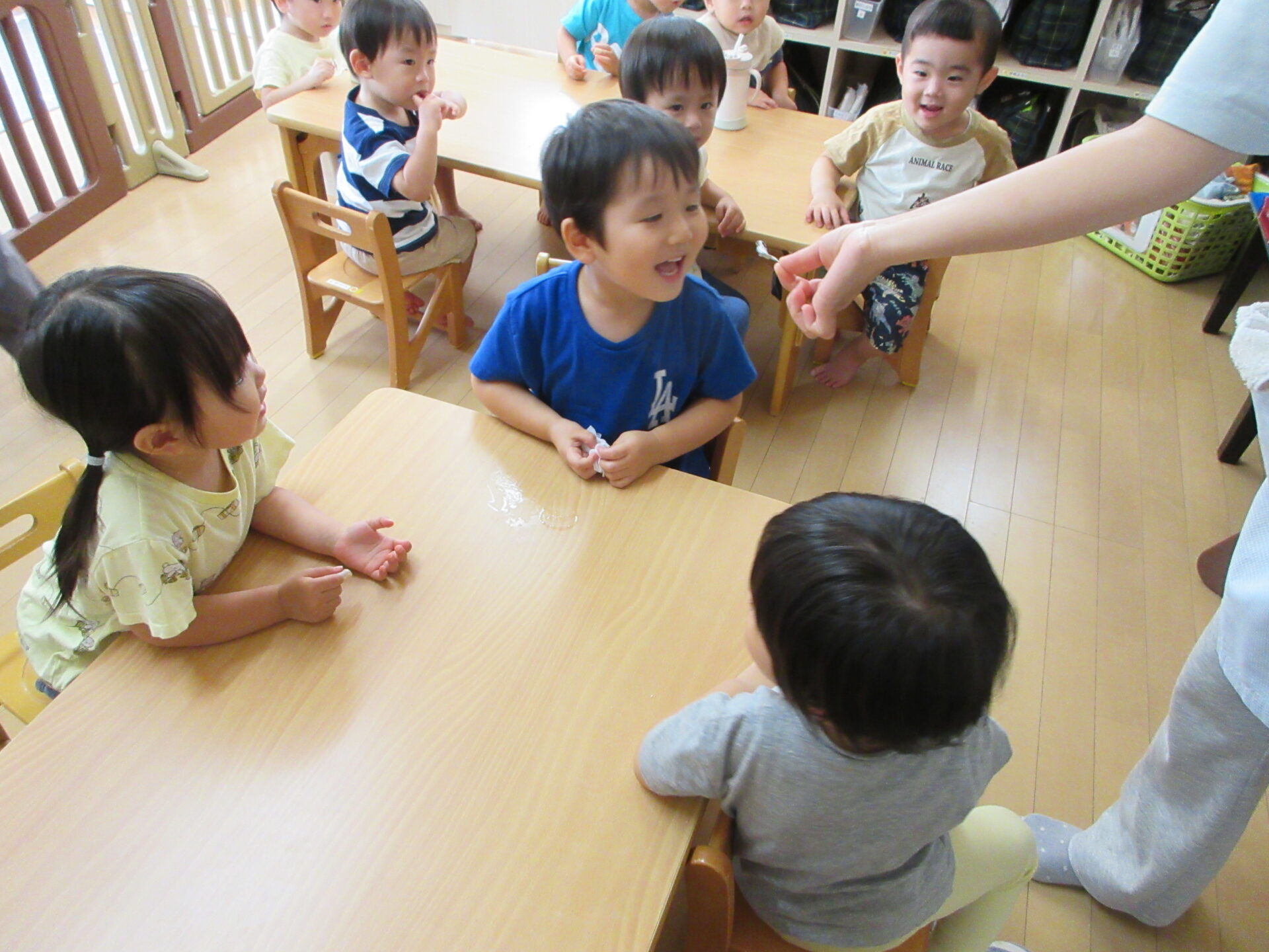 お魚には、みんなの体の中にある骨を強くしてくれるカルシウムが沢山入っているから、よく噛んで食べて、みんなの骨も強くしようねと、みんなで食べてみました😋