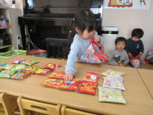 まずは、すばる保育園お菓子屋さんが開店!!お別れ遠足に持っていくお菓子のお買い物😊