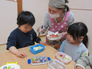 お次は、お弁当の準備!!保育園で作ってもらったお弁当を、自分のお弁当箱に詰めてもらいました🍙どの子も、ワクワクしている姿が、とっても可愛かったです💕