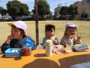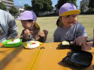 「お弁当を食べよう」と子どもたちに声を掛け、大きなシートを広げようと思っていたところ、子どもたちは、机といすを見つけ、座り始め、急遽予定を変更し、机で食べることにしました♪
