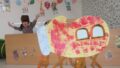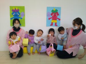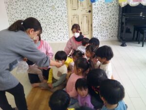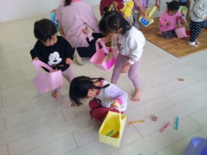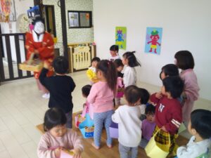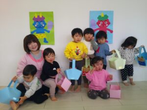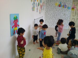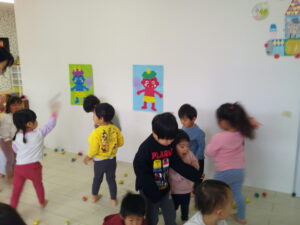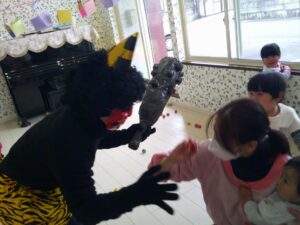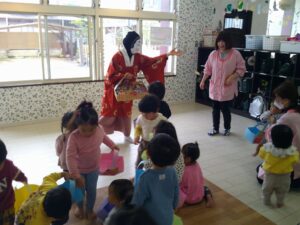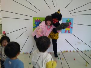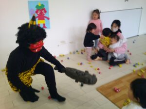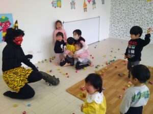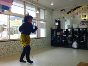 お話を聞いてから、オニの絵に向かってやっつけていると・・・