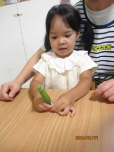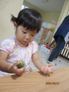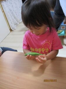 手に持ってみたり、握ってみたり、転がしてみたりしてオクラの感触をそれぞれ楽しんだよ