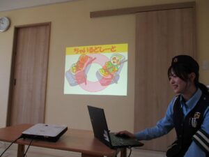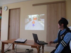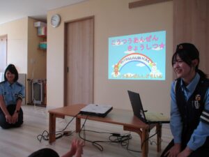 「道路の渡り方やシートベルトをしっかりしめて車に乗る」ことなどスクリーンでお話してくれました。