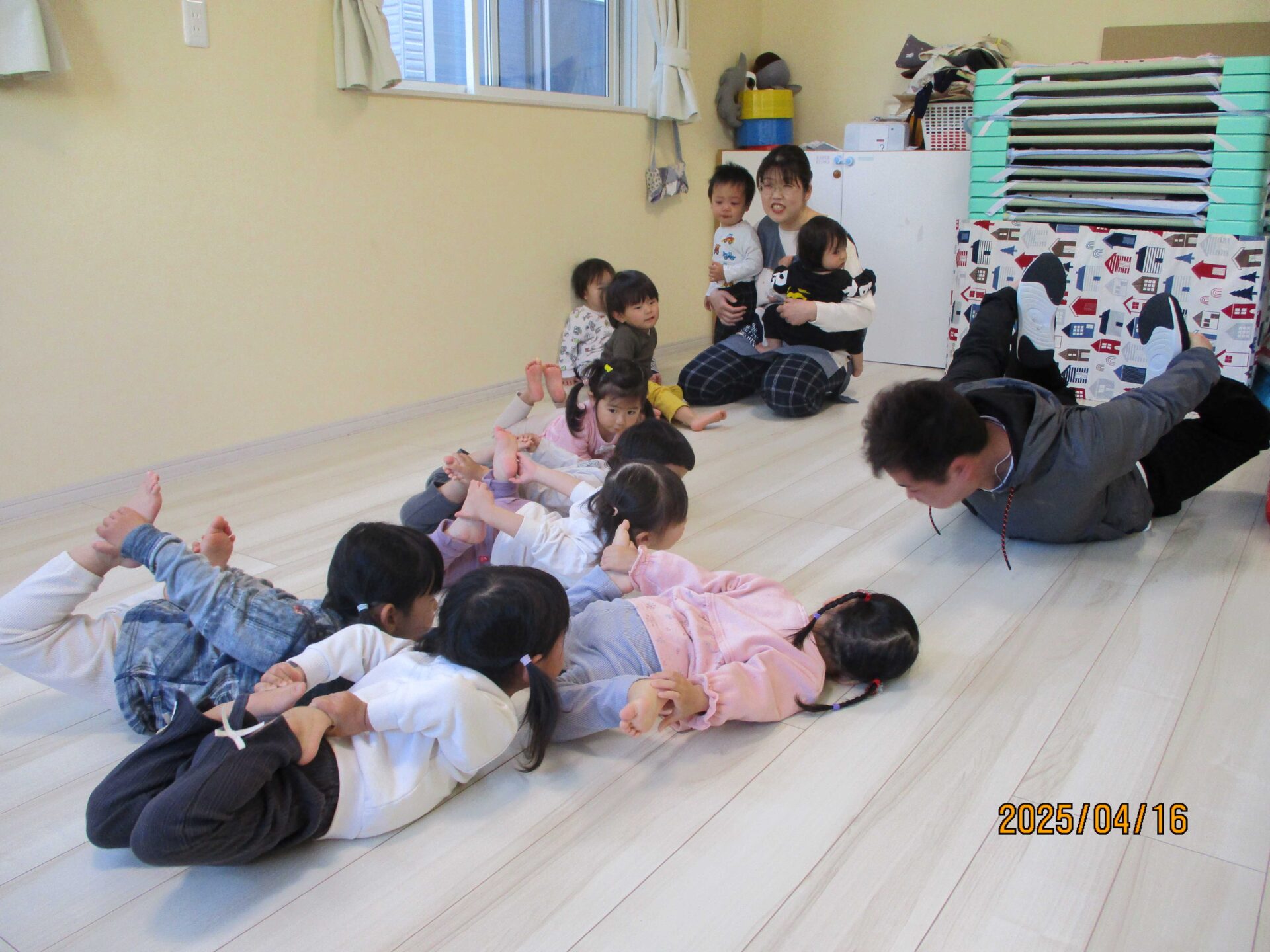 大きなマットを持ってきてくれました。ゆらゆら マットの上って楽しい!おっこちないようにね。(ゆらして体幹を鍛える)