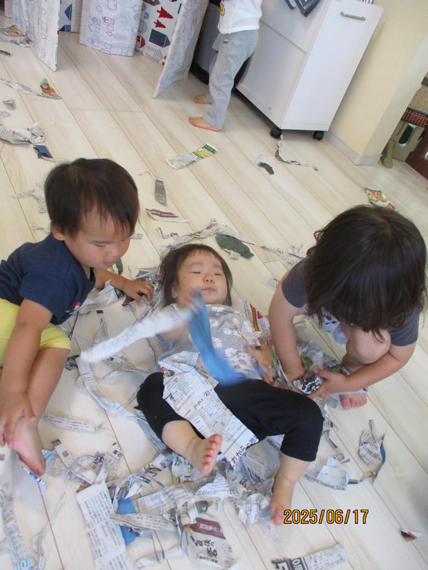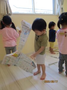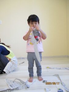 新聞紙遊び 未分類 2025.06.27 新聞紙をお部屋いっぱい広げるました。 最近は、新聞に触れる、見る機会がなくなっているお子さんもいるようです。ビリビリダイナミックに「やぶる」たくさん経験させてあげたいです。